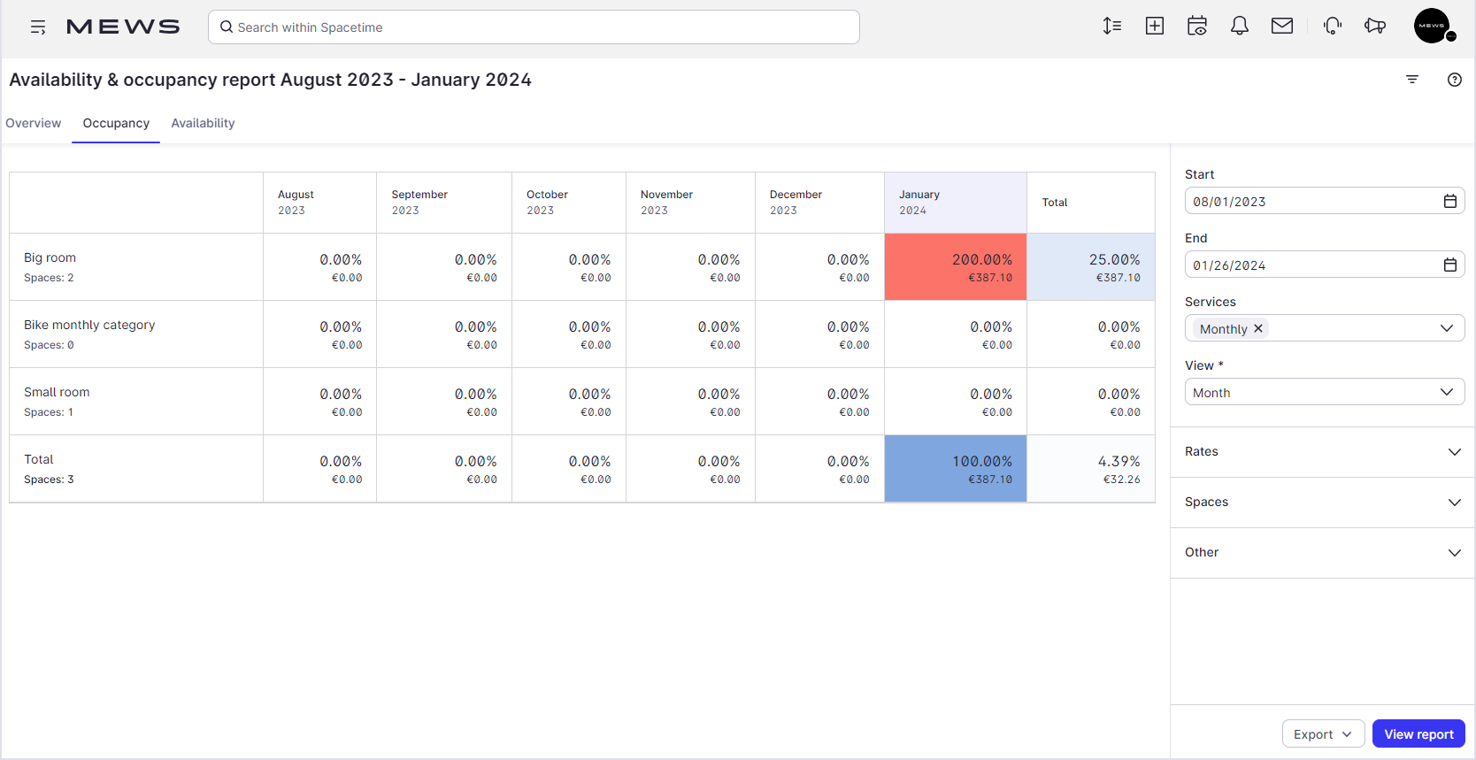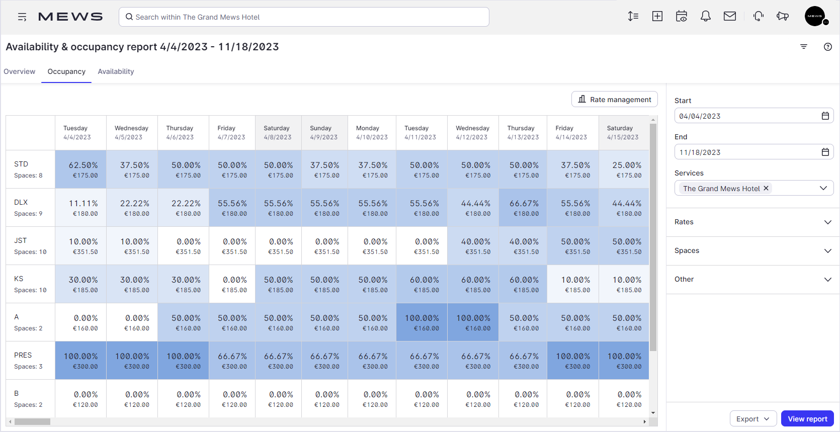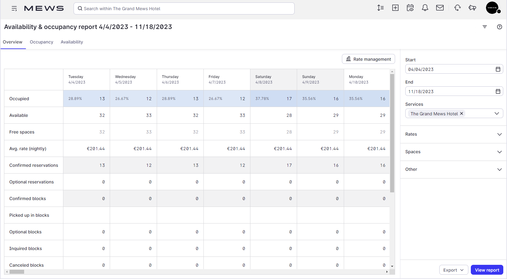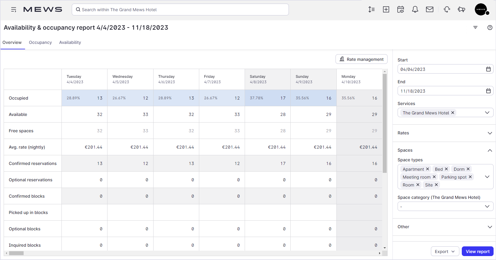 El Informe de disponibilidad y ocupación en Mews muestra: