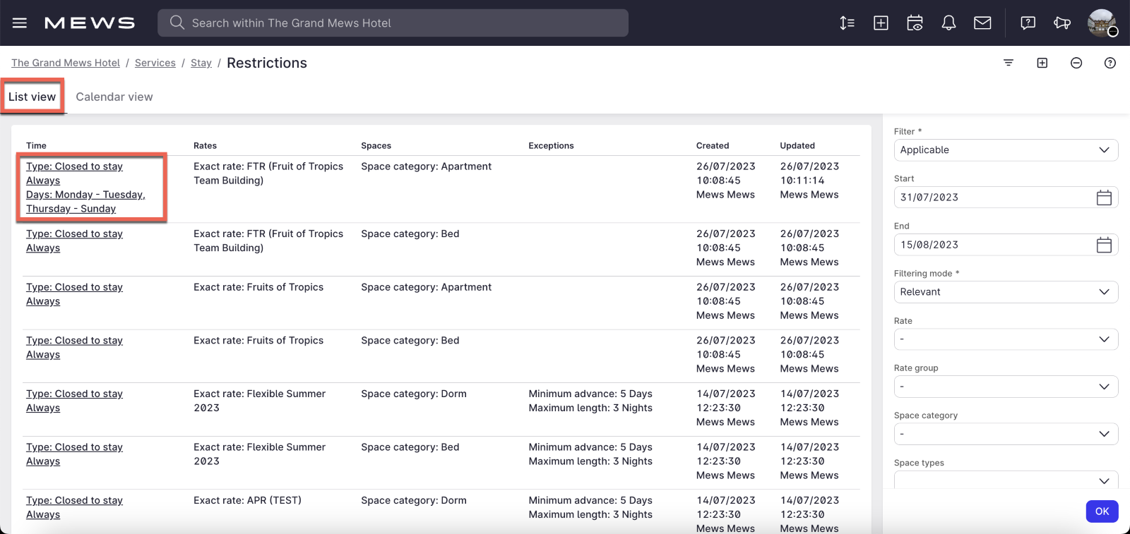 Por defecto, las restricciones se mostrarán en la pestaña Vista de lista, donde Mews organiza las restricciones en una lista. Para realizar modificaciones, puedes hacer clic en una restricción en la columna Tiempo. Puedes obtener más información sobre la edición de restricciones aquí.