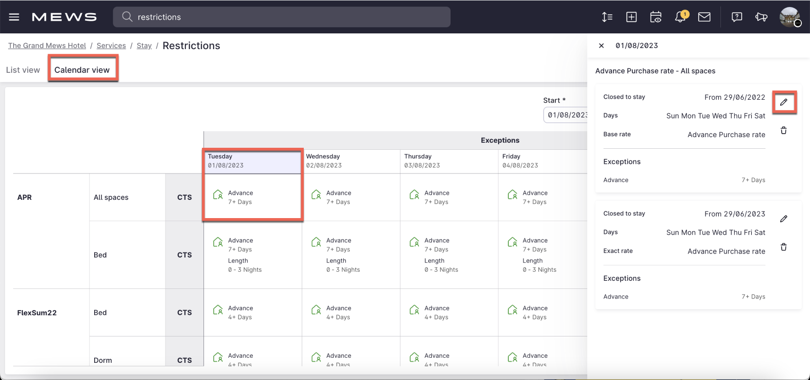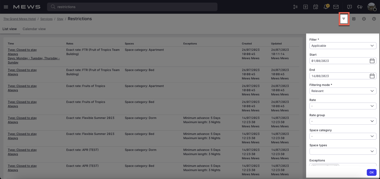 En Mews Operations puedes usar restricciones para impedir que los huéspedes hagan reservas si se cumplen ciertas condiciones. Esto te da más control sobre la gestión de tus reservas y hace que sea más fácil para tus gestores de ingresos administrar tu estrategia de precios.Puedes ver y gestionar tus restricciones en Mews Operations desde la pantalla Restricciones, donde puedes organizarlas en una lista o en un calendario.Puedes ver y gestionar tus restricciones en Mews Operations desde la pantalla Restricciones, donde puedes organizarlas en una lista o en un calendario.Puedes ver y gestionar tus restricciones en Mews Operations desde la pantalla Restricciones, donde puedes organizarlas en una lista o en un calendario.Puedes ver y gestionar tus restricciones en Mews Operations desde la pantalla Restricciones, donde puedes organizarlas en una lista o en un calendario. La vista de lista te permite buscar restricciones específicas utilizando filtros, y puedes obtener un resumen de las fechas que estás restringiendo utilizando la vista de calendario. Si no creas ninguna restricción, la página Restricciones permanece en blanco.Puedes crear, editar o eliminar las restricciones de una en una, o varias a la vez. Puedes obtener más información sobre esto aquí, y sobre la creación de restricciones aquí. Puedes consultar un resumen de los cambios realizados en la pantalla Revisar cambios antes de confirmarlos. Esto es útil para corregir errores y comprobar a qué reservas afecta el cambio.